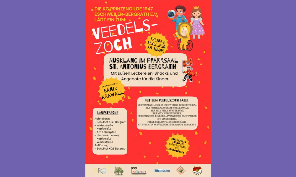 Die KG Prinzengilde 1947 Eschweiler-Bergrath e. V. veranstaltet nach vielen Jahren nochmal einen Umzug durch Eschweiler-Bergrath. Mit dabei sind neben den eigenen Uniformierten und Gruppierungen viele Einrichtungen; vor allem Kinder und Jugendliche. Wir als Kinderburg sind eine der Eschweiler Kitas, die den bunten Zug mitgestalten. Wir freuen uns auf viele begeisterte Fans und Kamelle-Fänger am Straßenrand!