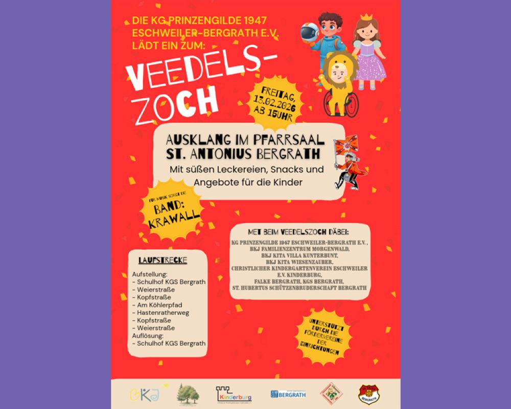 Die KG Prinzengilde 1947 Eschweiler-Bergrath e. V. veranstaltet nach vielen Jahren nochmal einen Umzug durch Eschweiler-Bergrath. Mit dabei sind neben den eigenen Uniformierten und Gruppierungen viele Einrichtungen; vor allem Kinder und Jugendliche. Wir als Kinderburg sind eine der Eschweiler Kitas, die den bunten Zug mitgestalten. Wir freuen uns auf viele begeisterte Fans und Kamelle-Fänger am Straßenrand!